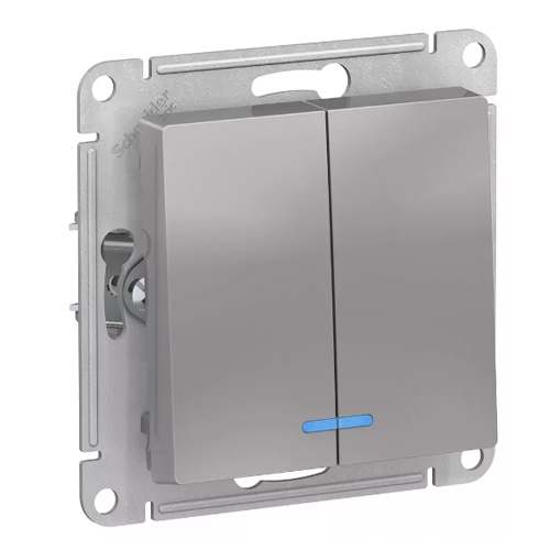 Механизм Schneider Electric AtlasDesign (в сборе, цвет алюминий) выключателя 2-клавишного с подсветкой подходит для сетей 250 В, на ток 10 А.