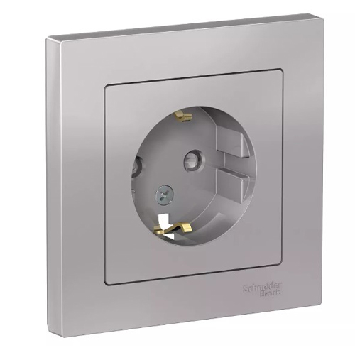 - Розетка Schneider Electric AtlasDesign (в сборе, цвет алюминий) одинарная с заземлением и без шторок подходит для сетей 250 В, на ток 16 А.