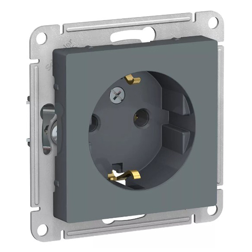 Механизм Schneider Electric AtlasDesign (в сборе, цвет грифель) розетки одинарной с заземлением и без шторок подходит для сетей 250 В, на ток 16 А.