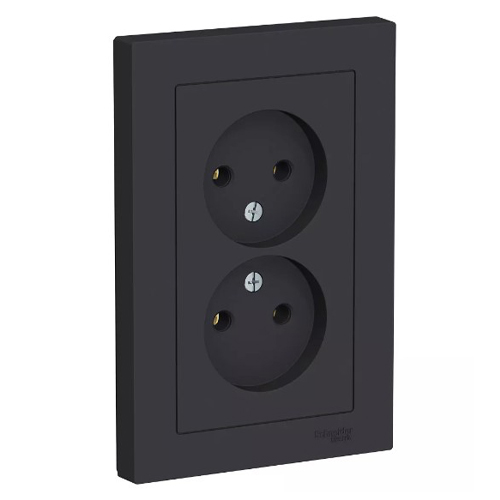 Розетка двойная Schneider Electric AtlasDesign (в сборе, цвет карбон) без заземления и без шторок подходит для сетей 250 В, на ток 16 А.