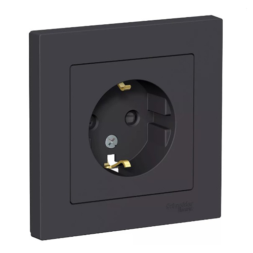 Розетка Schneider Electric AtlasDesign (в сборе, цвет карбон) одинарная с заземлением со шторками подходит для сетей 250 В, на ток 16 А.
