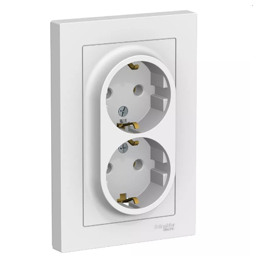 Розетка двойная Schneider Electric AtlasDesign (в сборе, цвет белый) с заземлением и без шторок подходит для сетей 250 В, на ток 16 А.