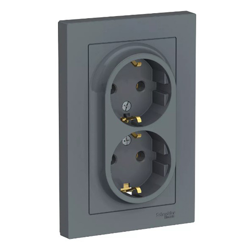 Розетка двойная Schneider Electric AtlasDesign (в сборе, цвет грифель) с заземлением, без шторок подходит для сетей 250 В, на ток 16 А.