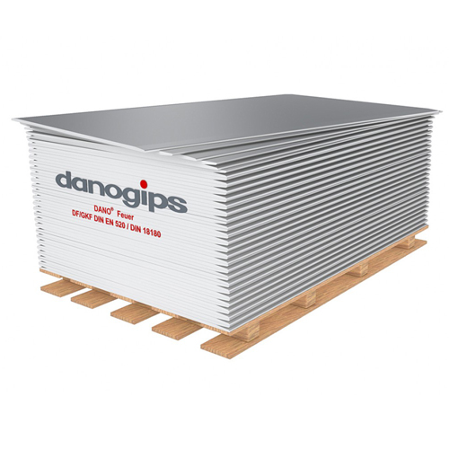 Гипсовые плиты Danogips производятся согласно ТУ 5742-001-79683717-2014. Они предназначены для устройства подвесных потолков, перегородок и облицовок стен внутри помещений. Состоят из двух слоёв специального картона и гипсового сердечника. С двух сторон они имеют утонченную кромку (УК) для удобства отделки стыков с применением бумажных лент и готовых полимерных шпатлёвок Danogips. Плита гипсовая обычная (ПГО) и влагостойкая (ПГВ) промаркированы с лицевой стороны серым и зелёным цветом картона соответственно.