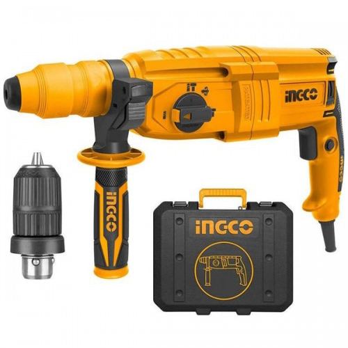 Перфоратор INGCO RGH9028-2 снабжен патроном SDS-plus ограничителем глубины сверления, электронной регулировкой частоты вращения, реверсом. Для удобства пользования инструментом дрель оборудована дополнительной рукояткой. П