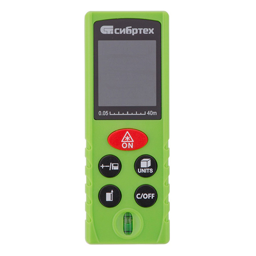 Лазерный дальномер PM-40 торговой марки Сибртех предназначен для измерения линейных расстояний, вычисления площадей и объемов. Легкое и компактное устройство, корпус изготовлен из прочного ABS-пластика. Дальномер имеет диапазон измерения от 0,05 до 40 м с точностью ±2 мм. Предусмотрен необходимый набор дополнительных опций: суммирование и вычитание показаний, вычисление площади и объема, вычисления по теореме Пифагора. Установлена функция автоматического выключения лазера (через 30 с) и отключения устройства (через 180 с). В корпус дальномера вмонтирован пузырьковый уровень, что гарантирует ровное расположение на любой поверхности. Работает от двух батареек типа ААА.