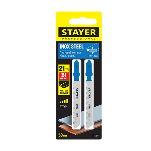 STAYER T118AF, полотна для эл/лобзика, Bi-Metal, по металлу (1,5-3мм), Т-хвостовик, шаг 1,4мм, 50мм, 2шт, STAYER Professional (арт. 15994-1.4_z02)