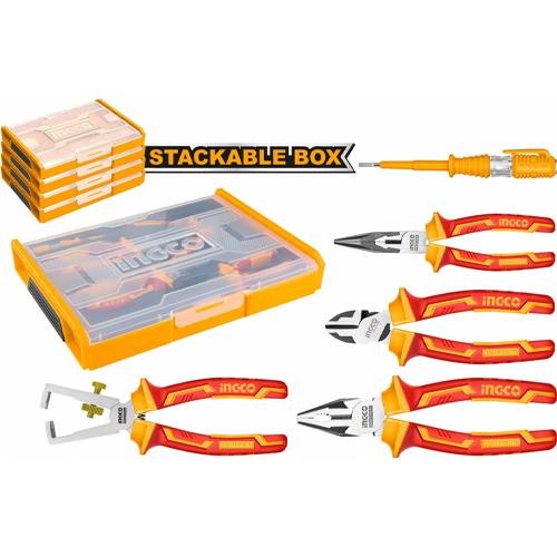 Набор диэлектрического инструмента 5 шт. INGCO HKTV01P051 INDUSTRIAL включает: диэлектрические плоскогубцы 18 см, диэлектрические бокорезы 16 см, диэлектрические длинногубцы 16 см, диэлектрические плоскогубцы для зачистки проводов 16 см, индикаторная отвертка 100-500 VAC.