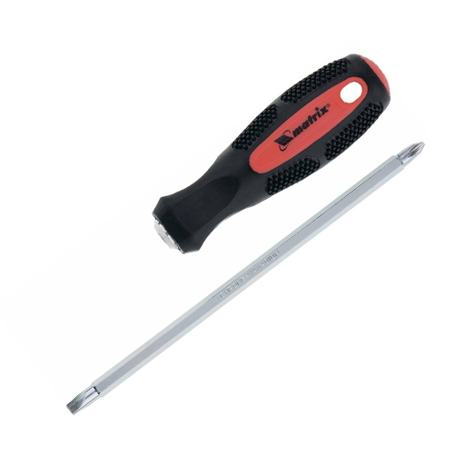 Комбинированная отвертка Matrix 12290, SL6,0 / PH2 мм, из стали CrV, с антискользящей двухкомпонентной рукояткой, за счет двухстороннего стержня позволяет производить монтаж/демонтаж резьбовых соединений сразу двух типов: Slotted и Phillips. Она станет незаменимым инструментом для строителей, монтажников, слесарей и частных мастеров. Благодаря длине стержня 150 мм отвертка легко достает до крепежа в углублениях.
