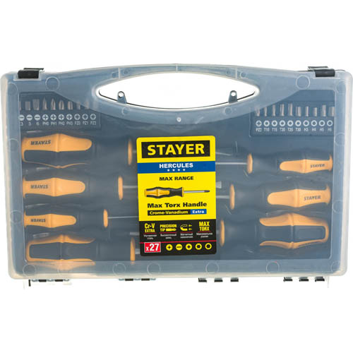 - Набор отверток Stayer MASTER HERCULES, Cr-V сталь, SUPER GRIP эргономичная 2К рукоятка, магнитый наконечник, в кейсе, 27 предметов 25827 имеет долгий срок службы