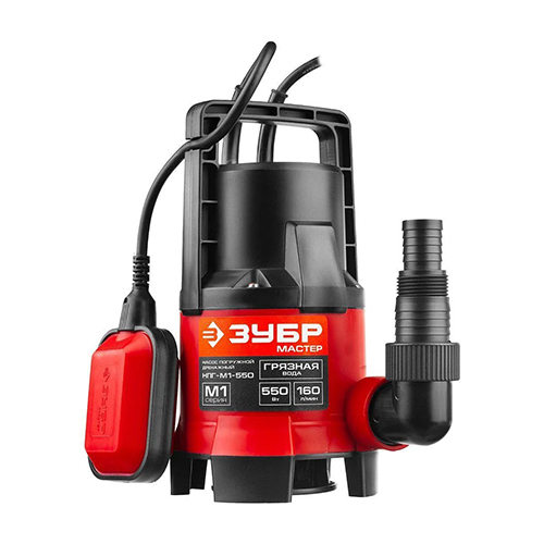 Дренажный насос погружной для грязной воды ЗУБР НПГ-М1-550, МАСТЕР, М1 (d частиц до 35 мм), 550 Вт, пропускная способность 160 л/мин, напор 6,5 м, с поплавком