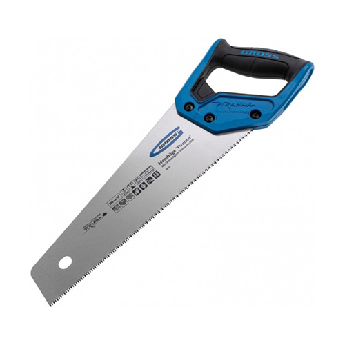 Ножовка по дереву Gross PIRANHA 24123 с полотном длиной 300 мм, калеными зубьями с 3D-заточкой и шагом 11 TPI, с 2-компонентной рукояткой, предназначена для распиловки заготовок из древесины, ДСП, ДВП, МДФ и ламината, а также из пластических материалов, таких как пенополистирол и полиуретан. Может производить продольный и поперечный распил. Мелкие зубья с шагом 11 TPI позволяют выполнять точный и чистый рез. Ножовка обладает высокой производительностью благодаря трехгранной заточке зубьев. Инструмент используется в столярном деле.ПреимуществаПолотно изготовлено из высококачественной японской стали SK-5, обладающей высокими прочностными характеристиками.Зубья закалены токами высокой частоты, что обеспечивает повышенную износостойкость рабочей части.Закалка зубьев на 2/3 высоты уменьшает вероятность их слома при обработке древесины твердых пород.На полотно нанесено полимерное покрытие для защиты от коррозии.Рукоятка выполнена из ударопрочного ABS-пластика, что увеличивает срок службы инструмента.Благодаря эргономичной форме и рифленой поверхности рукоятка удобно ложится в руку и не скользит, обеспечивая комфорт во время интенсивной работы.Инструмент изготовлен на тайваньском заводе с соблюдением всех технологических требований, что гарантирует его надежность.