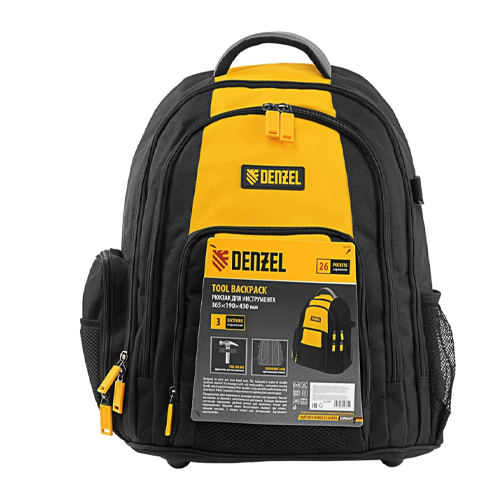 Рюкзак для инструмента Denzel 365x190x430 мм, 3 отделения, 26 карманов 90296 предназначен для транспортировки ручного инструмента. Изготовлен из прочного синтетического материала, устойчивого к истиранию. Оснащен боковыми сетчатыми карманами, удобной ручкой для переноски и дополнительной петлей для подвешивания.