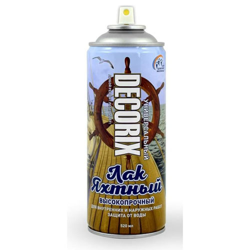 Аэрозольный яхтный лак Decorix (бесцветный; матовый; 520 мл) 0134-31 DX применяется для финишной защитно-декоративной отделки поверхностей палуб, палубных надстроек, кают и других деревянных элементов всех видов морских и речных судов.