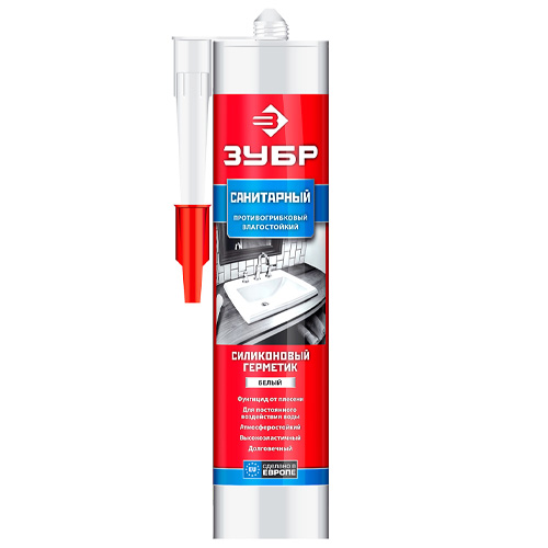 Герметик санитарный силиконовый ЗУБР 41235-0, применяется для сантехнических работ, остекления дверей, окон и других строительных конструкций, монтажа дверных коробок оконных рам, фасадные работы, монтаж и ремонт систем вентиляции. С фунгицидом против плесени. Высокоэластичный