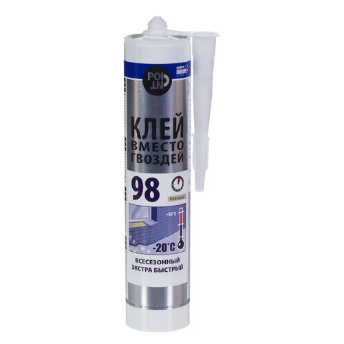 Клей мгновенный всесезонный Point 98 универсальный применяется для монтажных и отделочных работ внутри и снаружи помещения. При нанесении формирует эластичный бесцветный шов, аккуратный и незаметный на материале — важно при декорировании поверхностей. Однокомпонентный состав на базе синтетического каучука (Gummi) схватывается всего за 5-7 минут. После полного отвердевания состав выдерживает температуры в диапазоне от -20 °C до +60 °C.