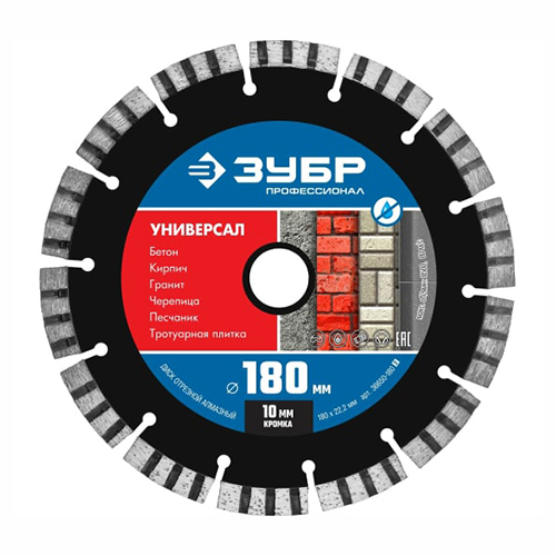 Диск отрезной алмазный сегментный для УШМ 180 х 22.2 мм, ЗУБР Профессионал Универсал 36650-180_z02, предназначен для быстрой и эффективной резки высокопрочного бетона, кирпича, тротуарной плитки, бордюрного камня и других строительных материалов без принудительного охлаждения. Корпуса алмазных кругов изготовлены из прочной легированной стали, способной выдержать значительную механическую нагрузку и высокую температуру.