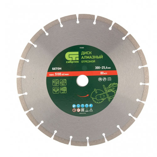 Диск алмазный СИБРТЕХ 731033 предназначен для использования на ручных бензорезах и швонарезчиках. применяется для резки бетона, кирпича, тротуарной плитки, камня и др. материалов.