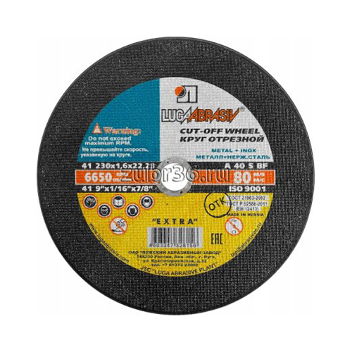 ЛУГА 230x1,6x22.2 мм, абразивный, круг отрезной по металлу для УШМ 3612-230-1.6 Для сохранения инструмента в рабочем состоянии, а так же предусмотренной гарантией завода изготовителя, наш интернет-магазин (zubr36) рекомендует использовать ЛУГА 230x1,6x22.2 мм, абразивный, круг отрезной по металлу для УШМ 3612-230-1.6 строго по назначению.