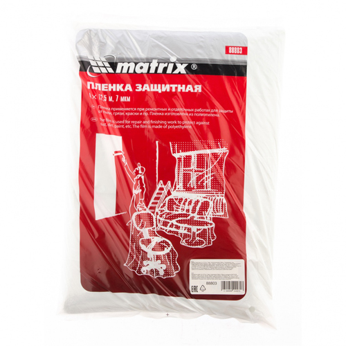 Защитная полиэтиленовая пленка Matrix 88803 плотностью 7 мкм и размером 4 х 12,5 м защищает предметы от краски, пыли, стружки, химических веществ при проведении строительных, ремонтных, покрасочных работ. Ею можно закрыть автомобиль, окна, мебель для защиты от загрязнений.